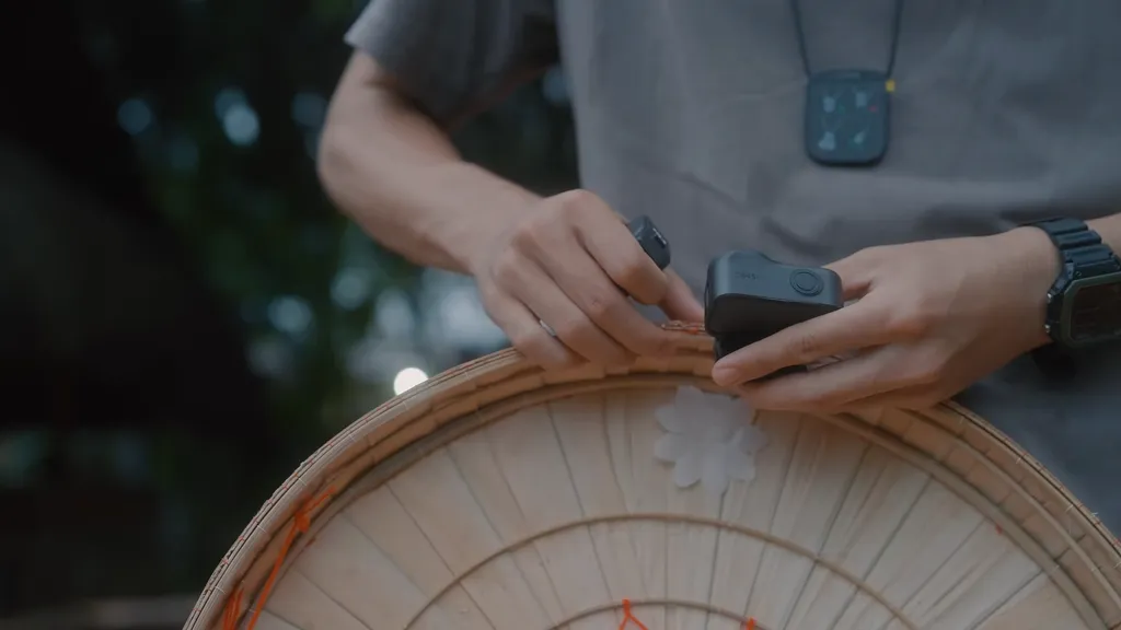 - Gắn trên mũ: Có một phụ kiện để gắn Nano lên mũ. Dù ban đầu mình thấy nó hơi nặng đầu và trông hơi “ngớ ngẩn”, nhưng góc quay POV từ mũ lại cực kỳ ấn tượng. Nó theo chuyển động của đầu mình, cho phép mình quay cả khi nhìn qua viewfinder hay màn hình máy ảnh, tạo ra những thước phim chân thực về quá trình làm việc.