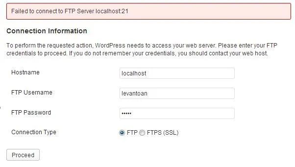 Lỗi “Failed to connect FTP server” thường xuất hiện khi thông tin FTP không chính xác hoặc WordPress không cần đến FTP.
