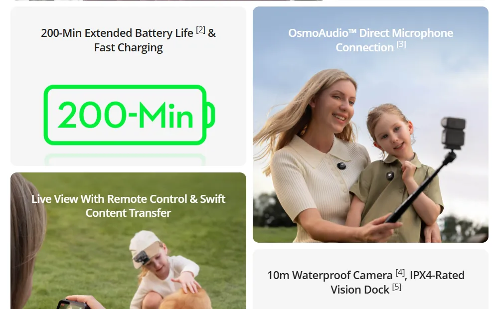 - OsmoAudio™ Direct Microphone Connection là một điểm cộng lớn cho những ai coi trọng chất lượng âm thanh, cho phép kết nối micrô ngoài để thu âm rõ ràng hơn, một yếu tố thường bị bỏ qua ở các camera hành trình nhỏ gọn.